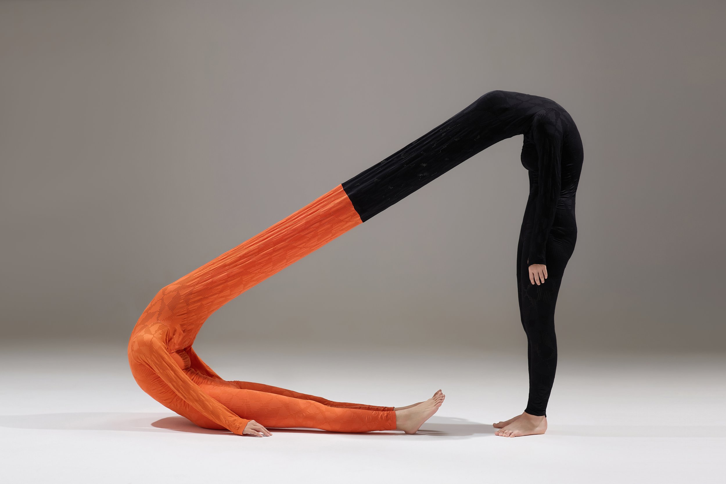 作品通过二件紧身衣的镜像连接,在形而上的层面,挑战单一自我观念,试图捕捉人的外在行为和内心世界——两个维度之间的并置与互动。无缝针织连体服,以交织的纤维和几何图形为媒介,将对称性与反射性相融合,寓意个体内外经验的交错和不断变化的界限。肢体舞动将这种内外对话转化为非语言性表达,展现心境和现实之间的多样性和复杂性,进而唤起人们对自我认知深层次的思考。